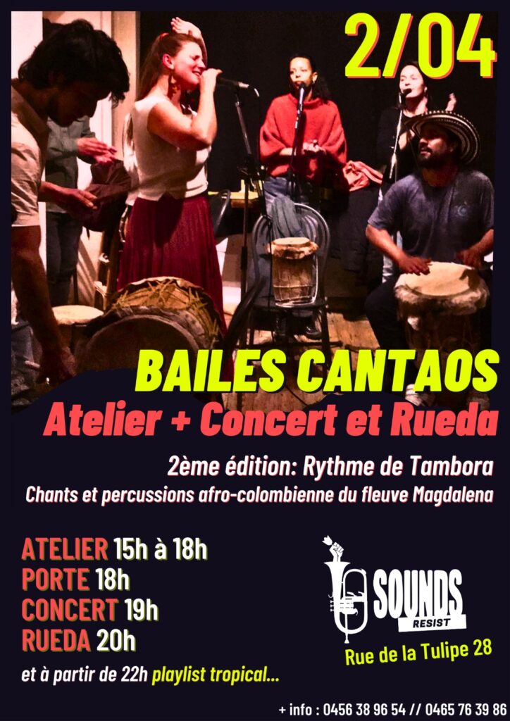 La soirée sera dédiée à une Rueda de Bailes Cantaos et de Gaitas. Pour ouvrir la soirée nous aurons un concert de musique traditionnel afro-colombienne. Les Rueda sont des « jam » traditionnelles où l’on se réuni pour jouer, chanter et danser sur les rythmes de Bullerengue, Tambora, Gaita, Cumbia, etc…
