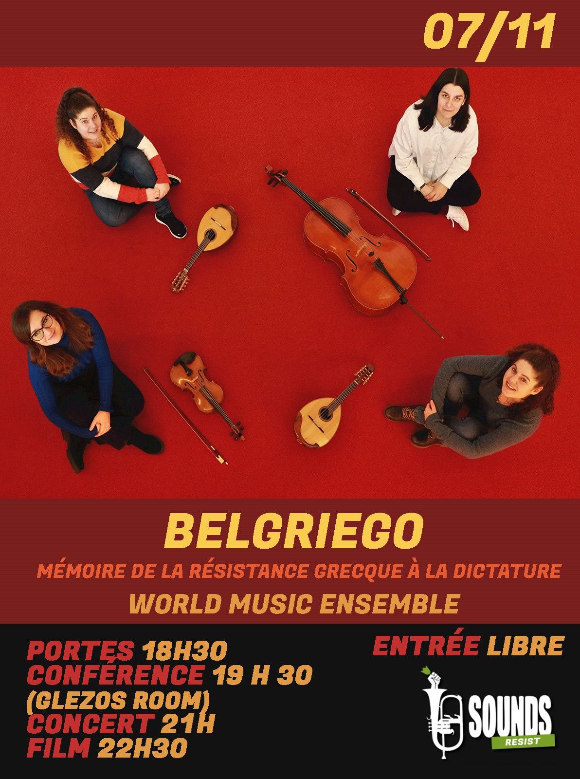 Belgriego est un ensemble de musique du monde qui explore les traditions de la Méditerranée. Le 7/11/23, près de 50 ans après la révolte historique anti-junte, Belgriego présentera une sélection de chansons politiques grecques emblématiques basées sur la poésie.