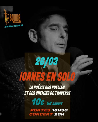 mots chantant les bas-fonds de la vie et de l’âme balafrée par les frontières. Dans une époque qui ne sevantera guère d’avoir été la plus joyeuse, Ioanes vous invite à siroter, dans un moment intimiste, des chansons nouvelles et anciennes, qu’il vous versera seul avec sa guitare, son chant et ses mots, épicés de son humour un peu relevé … La poésie des rues, des ruelles et des chemins de traverse redemande la parole, partout dans ce monde en feu, en guerre et en crise. Il est difficile de savoir ce qui adviendra, si l’on ne chante pas ce qui est…