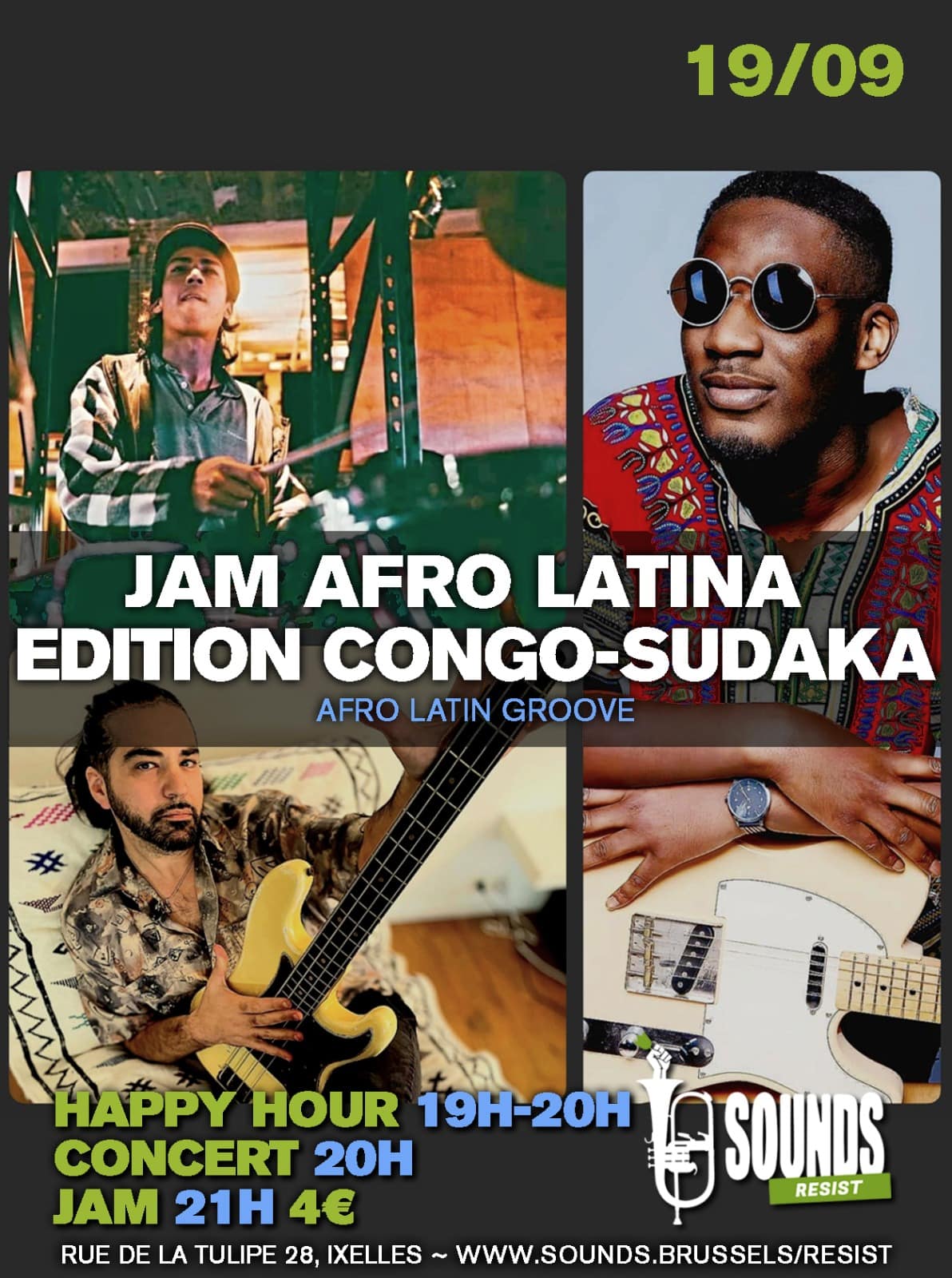 Venez profiter du happy hour de 19h à 20h, où vous pourrez déguster des boissons à prix réduits. Et ne ratez pas le groupe qui va ouvrir la jam avec un show explosif et entraînant. Que vous soyez musician.ne ou danseu.r.se, vous êtes les Bienvenu.e.s à participer à cette fête latino africaine. On vous attend nombreux.ses. au Sounds Resist, le lieu incontournable de la musique live à Bruxelles.