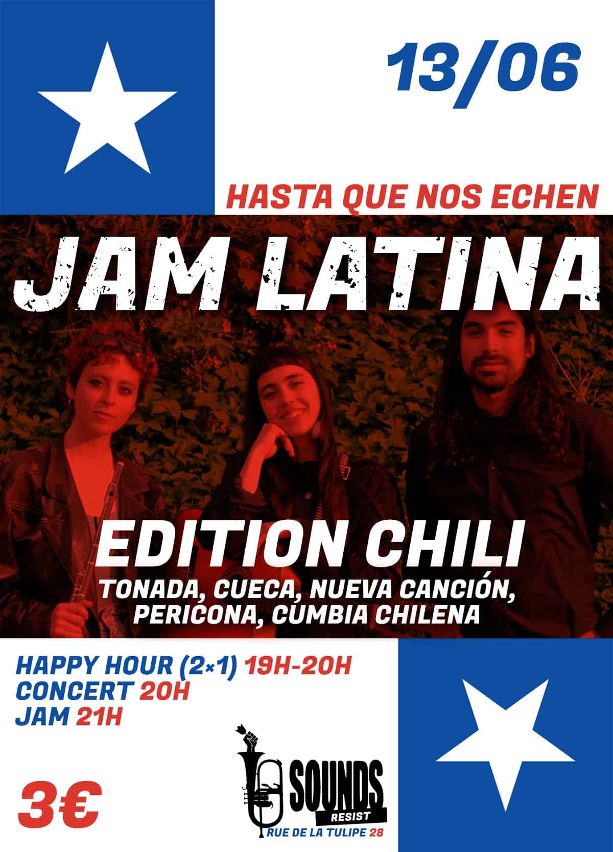 Dit jaar zal elke maandelijkse editie gewijd zijn aan een ander land uit de Latijns-Amerikaanse geluidswereld. De maand juni staat in het teken van Chili, met ritmes als TONADA, CUECA, NUEVA CANCIÓN, PERICONA en CUMBIA CHILENA. Met nieuwe muziek om van te genieten en ook nieuwe instrumenten tot uw beschikking om te spelen. Het doel is natuurlijk zoals altijd om “Latijnse muziek” te delen, zoals de chacarera, cumbia, salsa, samba, enz… maar ook om tradities, ritmekennis en stijlen uit heel Latijns-Amerika te delen. We willen een ontmoetingsplaats creëren met de hele wereld en met iedereen die muziek wil maken. Dansers zijn ook welkom, de sfeer zal op zijn hoogst zijn!