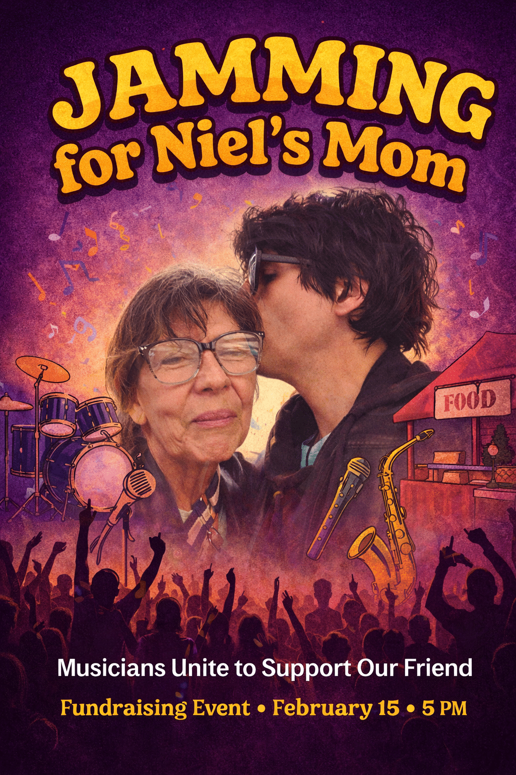 Bring your instrument, your talent, and your love. Let’s play together for one of our own.