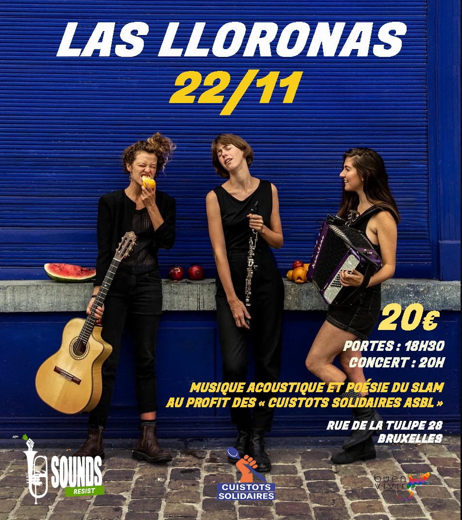 Venez écouter le magnifique groupe « Las Lloronas » qui offre un concert organisé par les Cuistots solidaires, une organisation magnifique qui distribue chaque semaine des milliers de repas aux migrants en rade à Bruxelles.