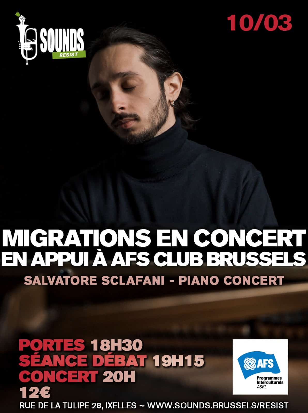Migrer signifie entreprendre un voyage physique qui change l’homme du but de son âme, et dans ses relations sociales. Avec ce concert, on veut mettre l’attention sur la puissance des migrations comme moteur de changement personnel et des sociétés. Ça serait aussi l’occasion de recollecter des fonds à dévouer a une bourse d’études pour aider un/une jeun/jeune étudiant/étudiante défavorisé/e de Brussels à prendre part à un échange scolaire de l’ASBL AFS Programmes Interculturels.