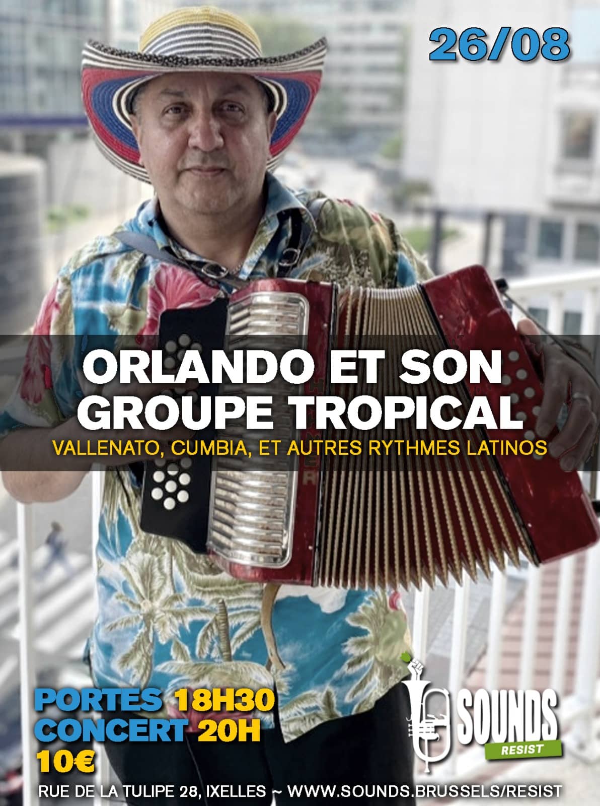 Alors ne manquez pas le premier concert de la saison du Orlando et son groupe Tropical chez le Sounds Resist! Ce groupe vous fera découvrir ou redécouvrir les richesses de la musique traditionnelle colombienne, notamment le vallenato, la cumbia, la musique tropicale et d’autres rythmes latins.