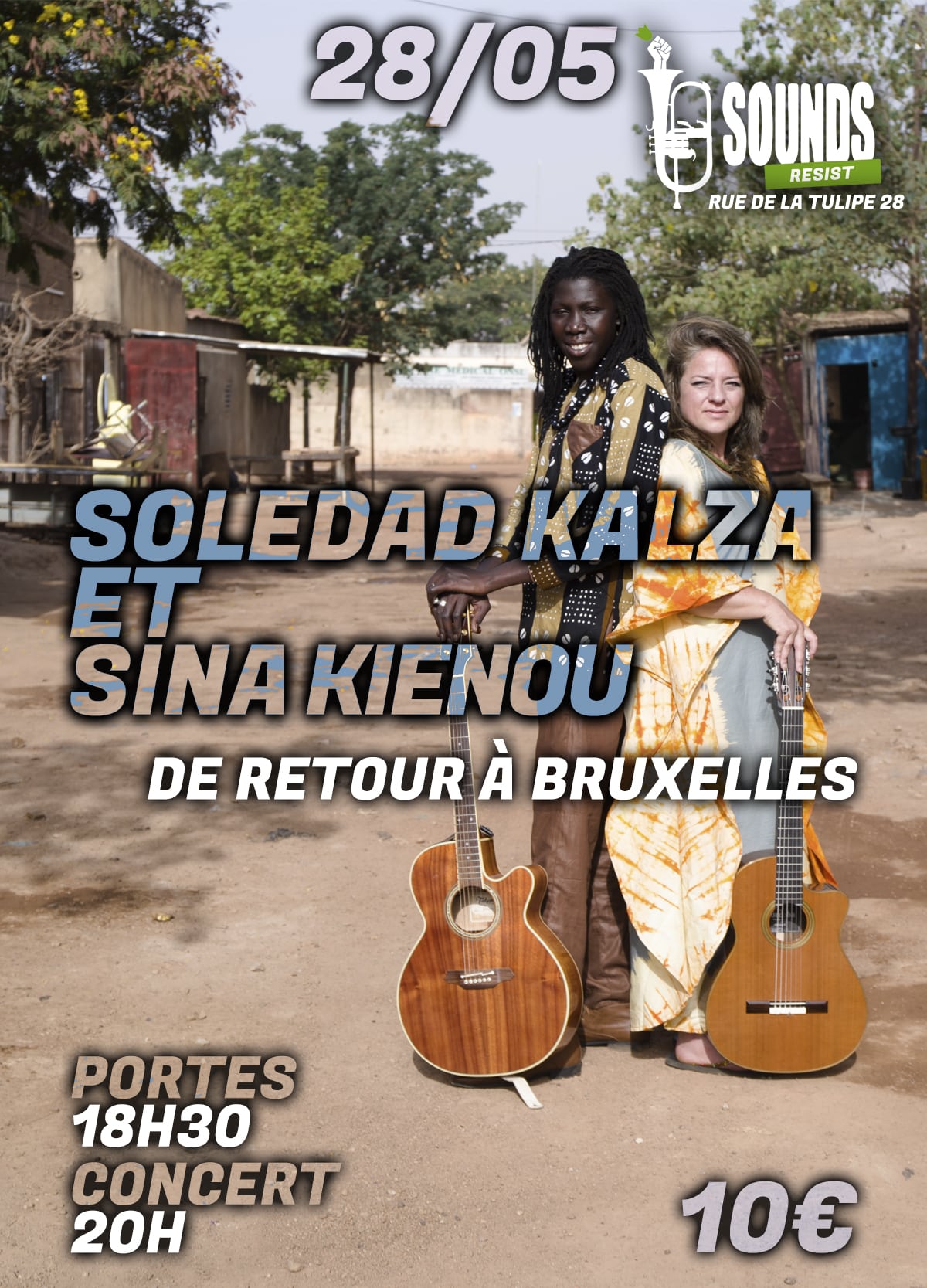 Invitado a participar en el Festival Salon de Musique organizado por Patrick Kabré en Ouagadougou au Burkina Faso, ils racontent et invoquent des influences et des nouveautés. Leurs chemins festoient les archipels d’Est en Ouest , des Caraïbes aux champs de coton du grand Nord , des paysanneries battues aux airs du rythme des saisons, des gammes mandingues aux blues du Sahel. Petit fils du Chef des Griots du Burkina Faso Baba Abdoulaye Kienou, Sina est également, aux côtés de Soledad, sa comparse et compagne, l’ambassadeur d’un langage universel dont les origines puisent leur héritage dans le Mandé .