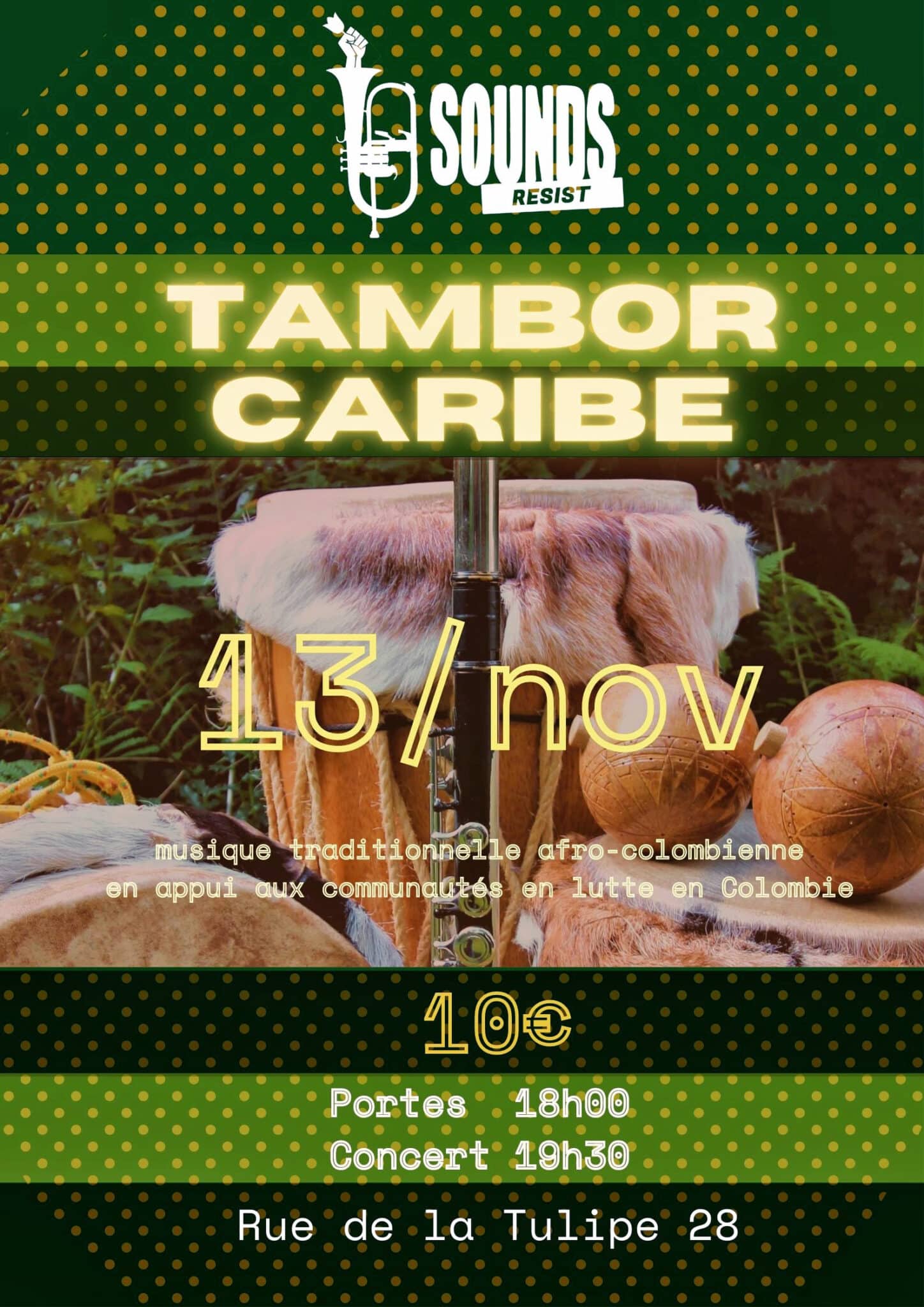 Tambor Caribe est un groupe formé par des percussionnistes latino-américains et des chanteuses européens. Ensemble, ils rendent hommage à la musique afrocolombienne avec un répertoire traditionnel de gaita et tambours.